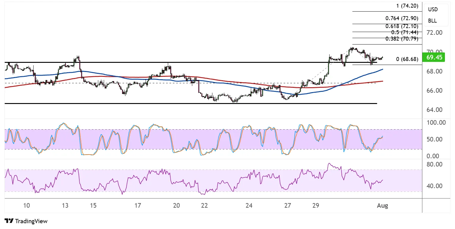 38.2%的延伸至70.79美元代表了最初的上行目标,而持续反弹可能会推动至50%的水平71.41美元,并进一步延伸61.8%至72.10美元。如果势头加速,74.20美元的心理水平也迫在眉睫,成为一个重要目标。