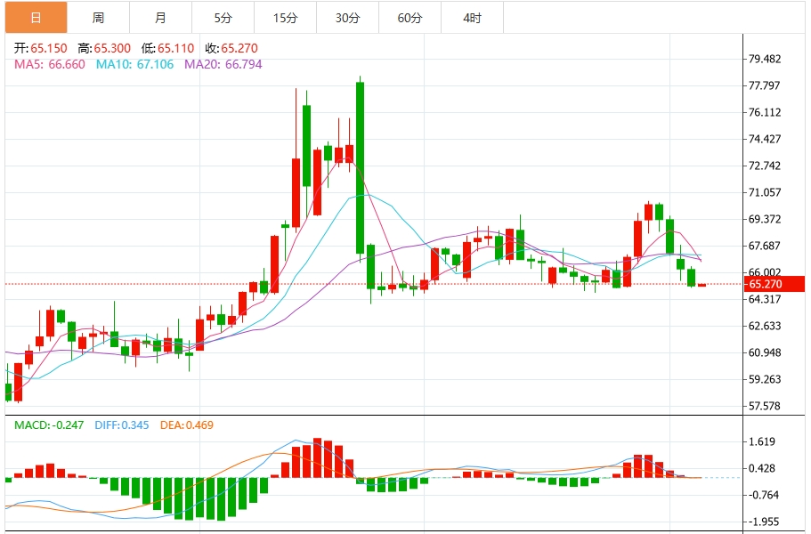 相对强弱指数(RSI)回升至中性区间上方,动能指标MACD虽仍处于负值区间,但出现缩口迹象,暗示下行动能正在减弱。整体来看,若无新的供应利空消息,WTI短期走势倾向震荡反弹格局,但上方均线压力依然明显,需关注能否放量突破。