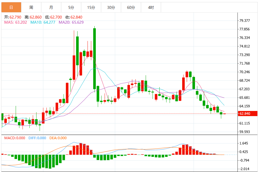 从日线走势看,WTI原油价格在连续下跌后于62.50美元附近获得初步支撑,目前短线反弹至63美元附近,但上方64.20-64.50美元区间存在较强阻力,该区域同时接近20日均线位置。
