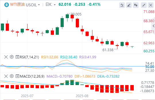 从长期宏观角度来看,供应过剩的局面正推动WTI原油价格进行盘整。1小时图表上,MACD指标平缓并伴有轻微看跌交叉,随机指标(Stochastic)徘徊在超卖区域附近,而DMI指标则显示趋势动能耗尽。这表明油价短期下行空间有限,但容易陷入震荡盘整。