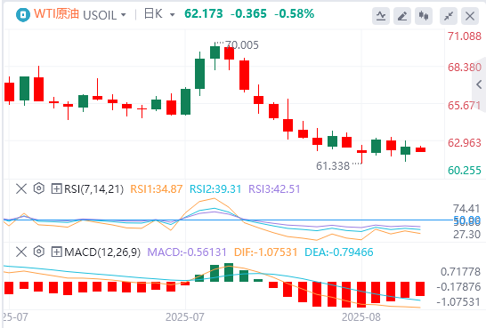 美国总统唐纳德·特朗普周五在阿拉斯加举行的美俄峰会未果后举行会谈后,WTI 原油小幅走高。交易员等待美国石油协会 (API) 将于周二晚些时候发布的每周原油库存。截至目前,WTI原油报价62.17美元,Brent原油报价65.72美元。