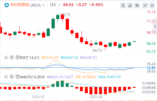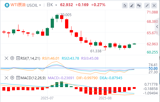 尽管欧美持续推动和谈,但普京与乌克兰之间的直接谈判仍未取得进展。西方可能对俄实施额外制裁,进一步限制其石油出口。在此背景下,买盘压力短期内可能保持稳固。只是市场情绪呈现分化态势,情绪指标显示仅有11.81%的投资者对市场在未来三个月的表现持有乐观态度,45.14%持悲观预期,而中性情绪持续攀升至43.06%,反映市场对冲突实际影响的持续不确定性。日线级别图表显示,14日RSI逐步逼近50轴,的MACD的柱状图在零轴附近徘徊,表明缺乏明确方向。上方关键阻力关注50日和200日均线交汇的67美元以及61.8%回撤位64美元。下方重要支撑为整数关口60美元。我认为在当前的环境下,油价短期内或维持震荡格局,直到出现更明确的催化因素。