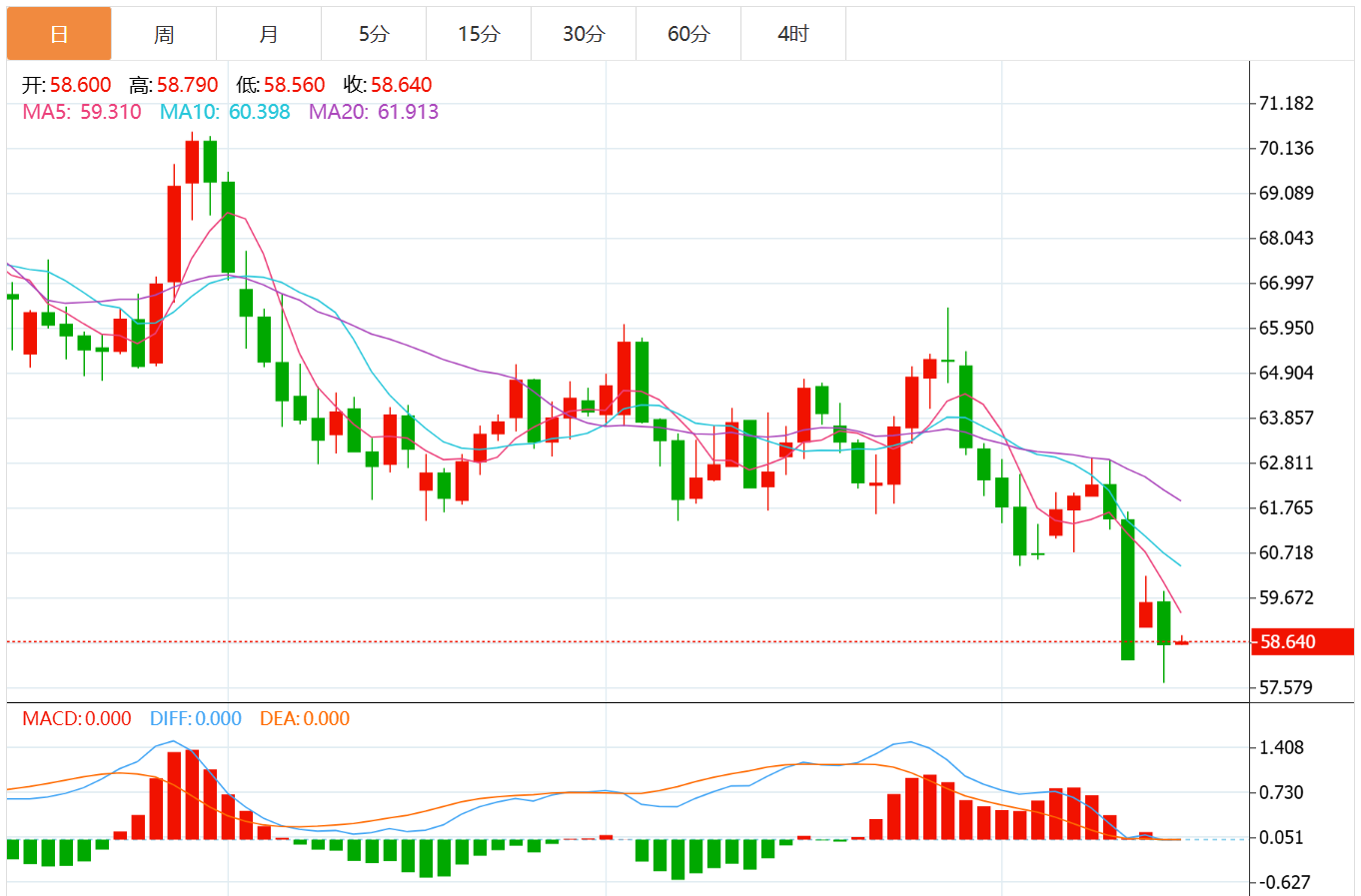 技术日线图形来看,价格已连续数日运行在主要均线下方,呈现明显的空头排列格局。当前WTI交投于58美元附近支撑区间,若该价位被有效跌破,下一目标或指向56.40美元区域,为前期底部支撑带。