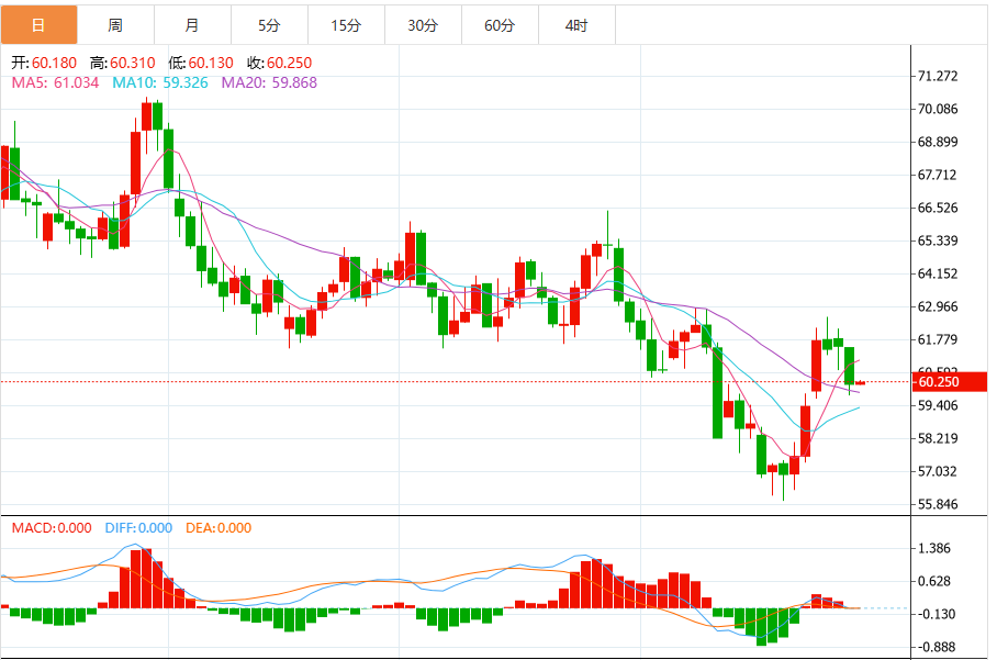 周三亚盘,美原油交投于60.24美元/桶附近,油价周二下跌超2%,投资者评估美国对俄罗斯两大石油公司的制裁对全球供应的影响,以及OPEC+可能在12月增产的计划。