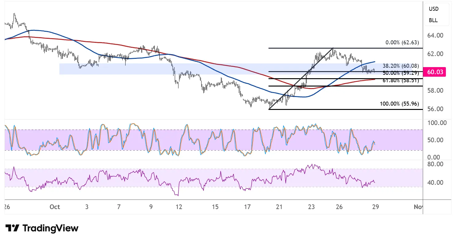 价格目前正在测试59-60美元附近的感兴趣区域,该区域与38.2%斐波那契回撤位60.08美元和50%斐波那契回撤位59.29美元相吻合。该区域此前在10月下跌期间充当阻力位,现在可能成为正在萌芽的上升趋势的支撑。