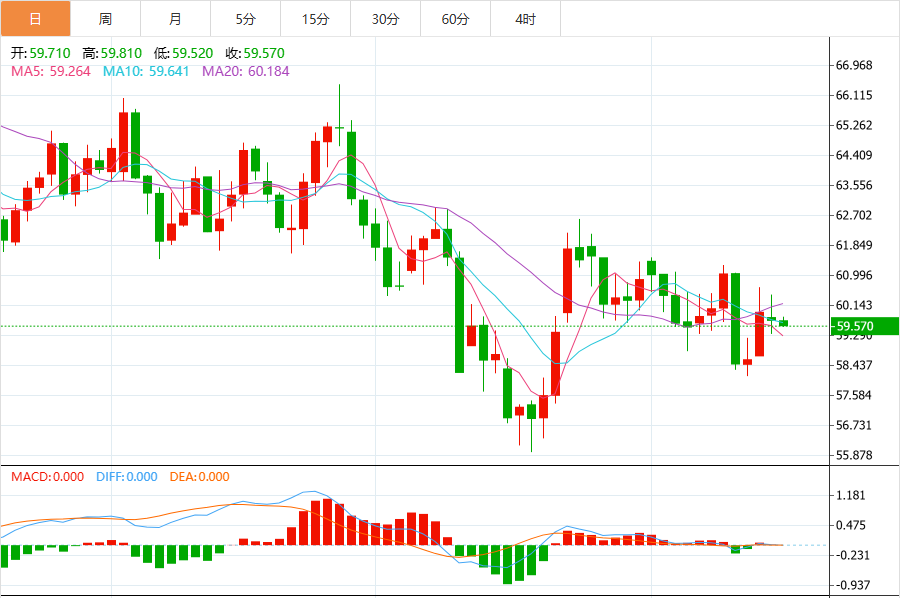 从日线结构来看,美原油(WTI)整体保持弱势震荡格局。价格运行在主要均线下方,趋势性压力较为明显。日线K线连续在60美元附近拉出小实体波动,显示多空力量均未占据绝对优势。