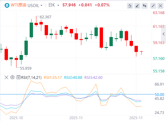 随着美国推动俄乌和平协议,WTI略微走低。交易员们正等待美国石油协会(API)周二晚些时候发布的每周原油库存报告。截至目前,WTI原油报价57.94美元,Brent原油报价61.95美元。