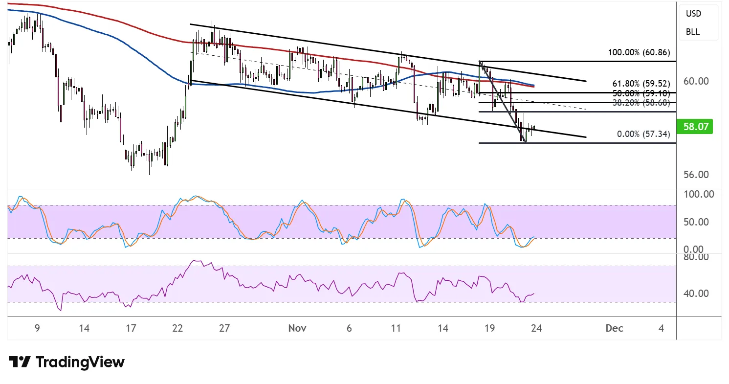 不过,价格似乎在57.34美元附近开始盘整,因此可能会在抛售恢复前出现回调。斐波那契回撤工具显示了更多卖家可能在哪些地方等待进入下跌趋势。