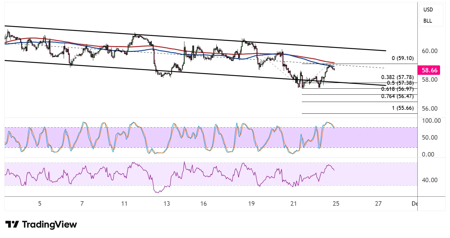 最近的支撑位是38.2%的Fib延伸位,约57.78美元,其次是50%的57.38美元。持续下跌可能使原油跌至61.8%的斐尔比亚56.97美元,甚至76.4%的延伸价56.47美元。最后一个下行目标位于100%Fib延伸点,接近每桶55.66美元。