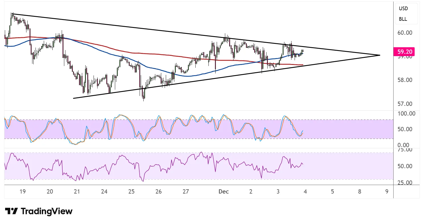 价格目前交易价格约为每桶59.20美元,夹在过去几周收敛趋势线的收缩中,这些趋势线一直压制着价格走势。