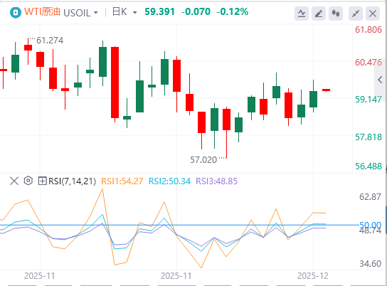 原油价格已从通道内的疲弱转为突破,50日均线成为当前的直接障碍。日收盘价若突破60.06美元并保持50日上方,则确认买方控制,目标为63.03美元最低点;周线反转和疲惫的下降通道强化了卖方疲惫不堪的观点,价格上涨还在前方。当然,只要价格跌破58.36美元,这个论点就会被否定。