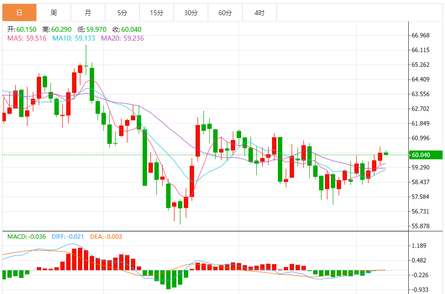 实时行情显示,油价日内波动呈现“低开高走”特征。WTI原油开盘价59.7美元/桶,盘中最低触及59.42美元/桶,随后在中东地缘局势升温的消息推动下逐步回升,最高冲至60.5美元/桶。这一走势反映出市场情绪的谨慎性——美国原油库存意外增加的利空效应持续发酵,但海上运输通道的安全风险又为油价提供底部支撑,多空双方博弈激烈。