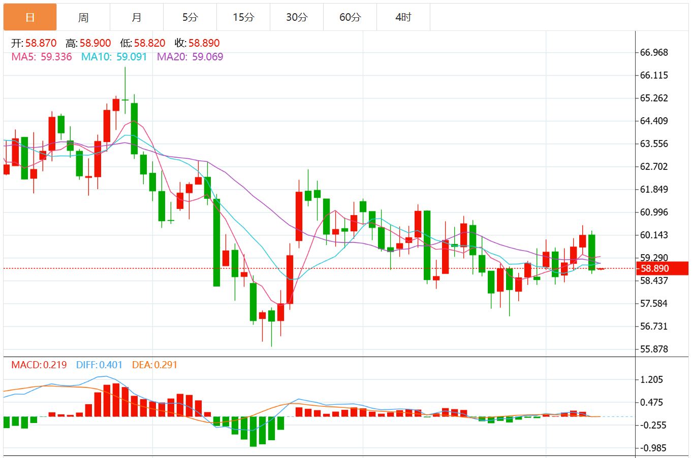 此外,布林带中轨附近的59-60美元区间成为多空争夺的关键点位,一旦日线收盘继续跌破中轨,下方可能重新测试57.5与56.8两个支撑区。整体来看,美原油目前处于高位震荡后的调整阶段,趋势方向尚需等待消息面与美联储政策落地后的进一步确认。