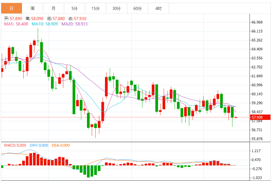 原油从日线图级别看,从局部级别看,当下震荡节奏呈次要震荡,K线阴阳反复交替,向前期低点56附近进行测试。MACD指标在零轴下方附近交织,空头表现无力度,56强支撑位被跌破,则原油走势中期将进入下行节奏。原油短线(1H)走势延续下行测试57.60附近,获得强支撑,转为上行。