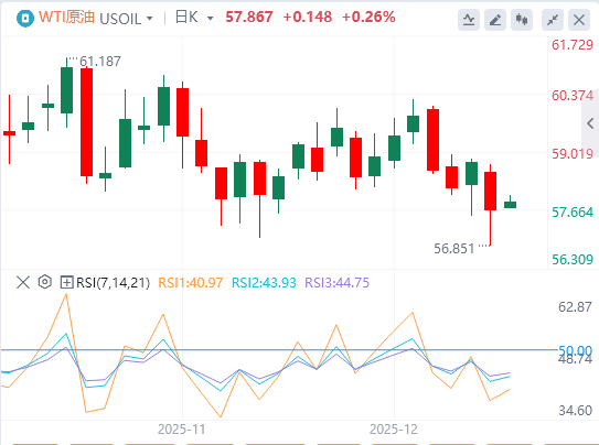 WTI价格在地缘政治因素影响下,包括美国扣押委内瑞拉附近一艘受制裁油轮,收复了近两个月来的最低收盘价。截至目前,WTI原油报价57.86美元,Brent原油报价61.99美元。