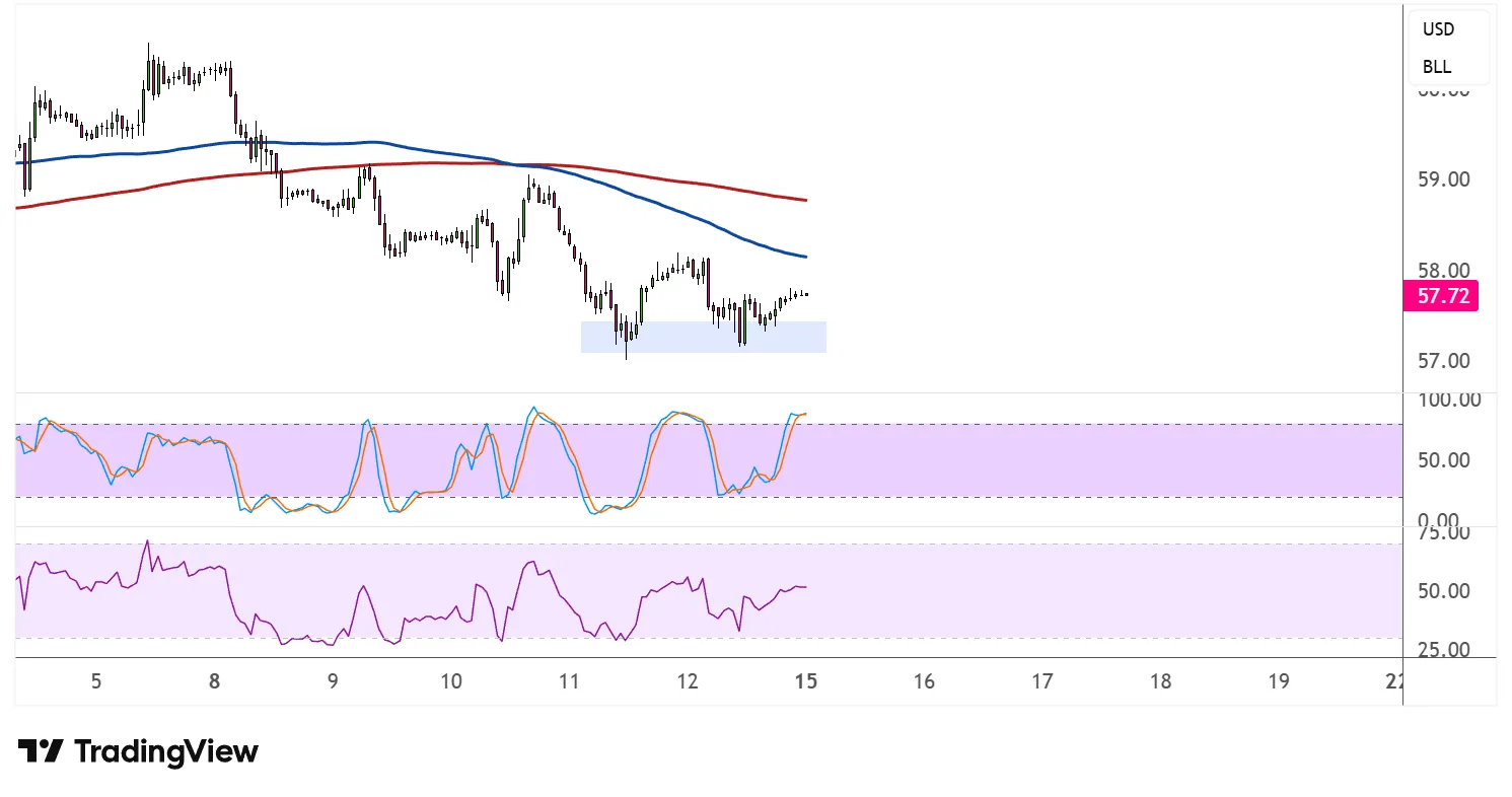 价格曾两次测试57.00-57.30美元区间的支撑,两次均坚守并推动该关键底线反弹。57美元附近的双低显示出强劲买盘,交易者似乎愿意守住该支撑区。