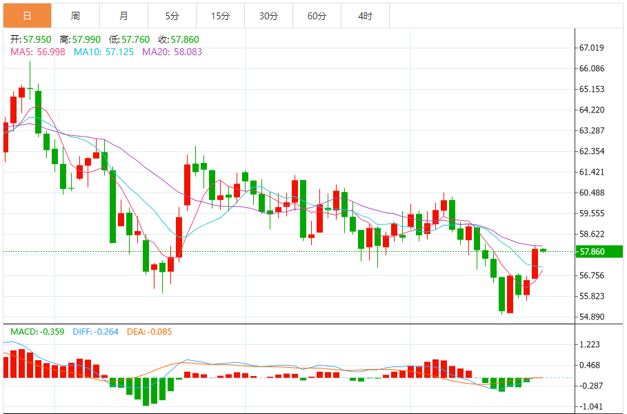 但从整体结构看,WTI仍运行在中期下降通道内,上方60美元—61美元区域对应20日均线与前期密集压力,构成短线反弹的重要阻力。指标方面,RSI自超卖区间回升至40附近,动能有所改善但尚未进入强势区,MACD绿柱明显收敛,存在形成金叉的可能。