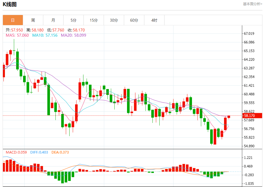 在日线级别上来看,美原油(WTI)在前期连续回落后于56美元附近获得明显支撑,该位置对应年内低位区域,同时也是前期成交密集区,买盘防守意愿较强。价格重新站上5日与10日短期均线,显示地缘风险推动下,多头情绪明显修复;