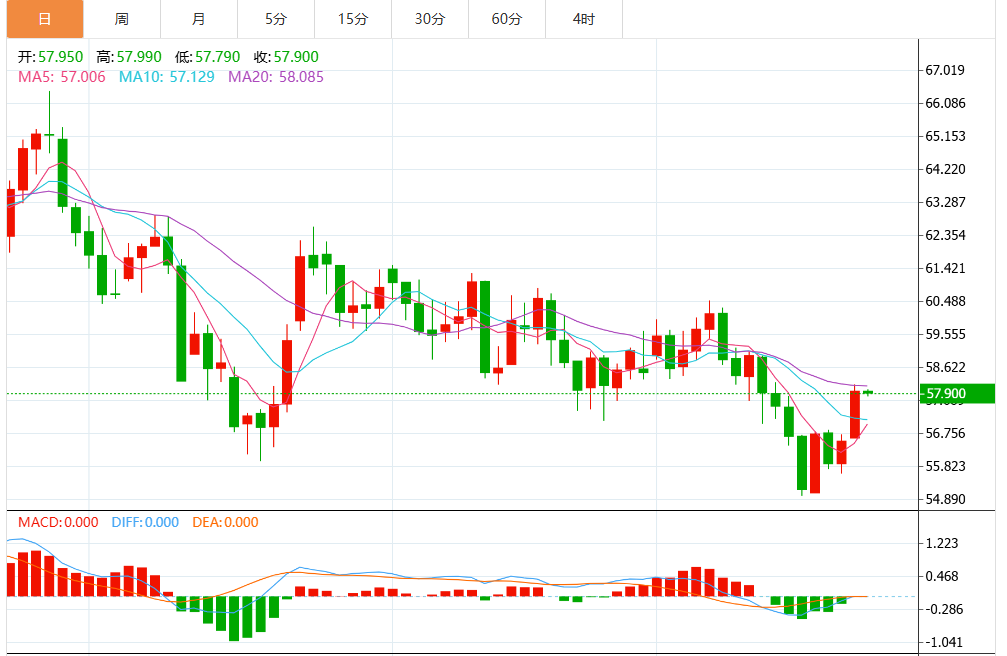 在下行方面,初步支撑位于56.50美元附近,随后是55.00美元的整数关口。 跌破该区域将重新打开向多年来低点的下行风险,处于更广泛的看跌结构中。