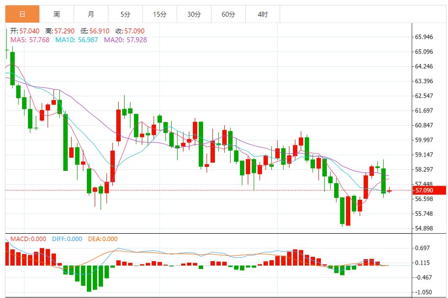 周一,美国原油WTI价格交投于每桶57.10美元附近,小幅走高。市场普遍认为,亚洲国家需求前景改善的预期为油价提供了一定支撑。同时,投资者正等待将于周二公布的美国石油协会(API)原油库存数据,以寻找新的交易指引。