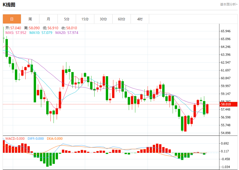 操作:57.8-58.0站稳做多,止损57.6,目标58.2-58.5;58.2-58.5遇阻做空,止损58.7,目标57.8-58.0。