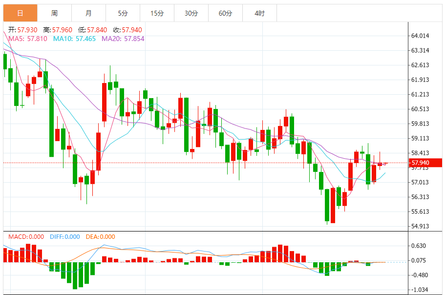周三(12月31日),美原油价格交投于57.930美元/桶附近,跌幅为0.03%。