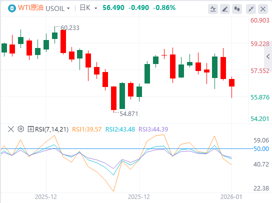 WTI美国原油周三下跌,报约56.10美元。14天相对强弱指数(RSI)在41.68点,表示无超卖信号的弱势动能。