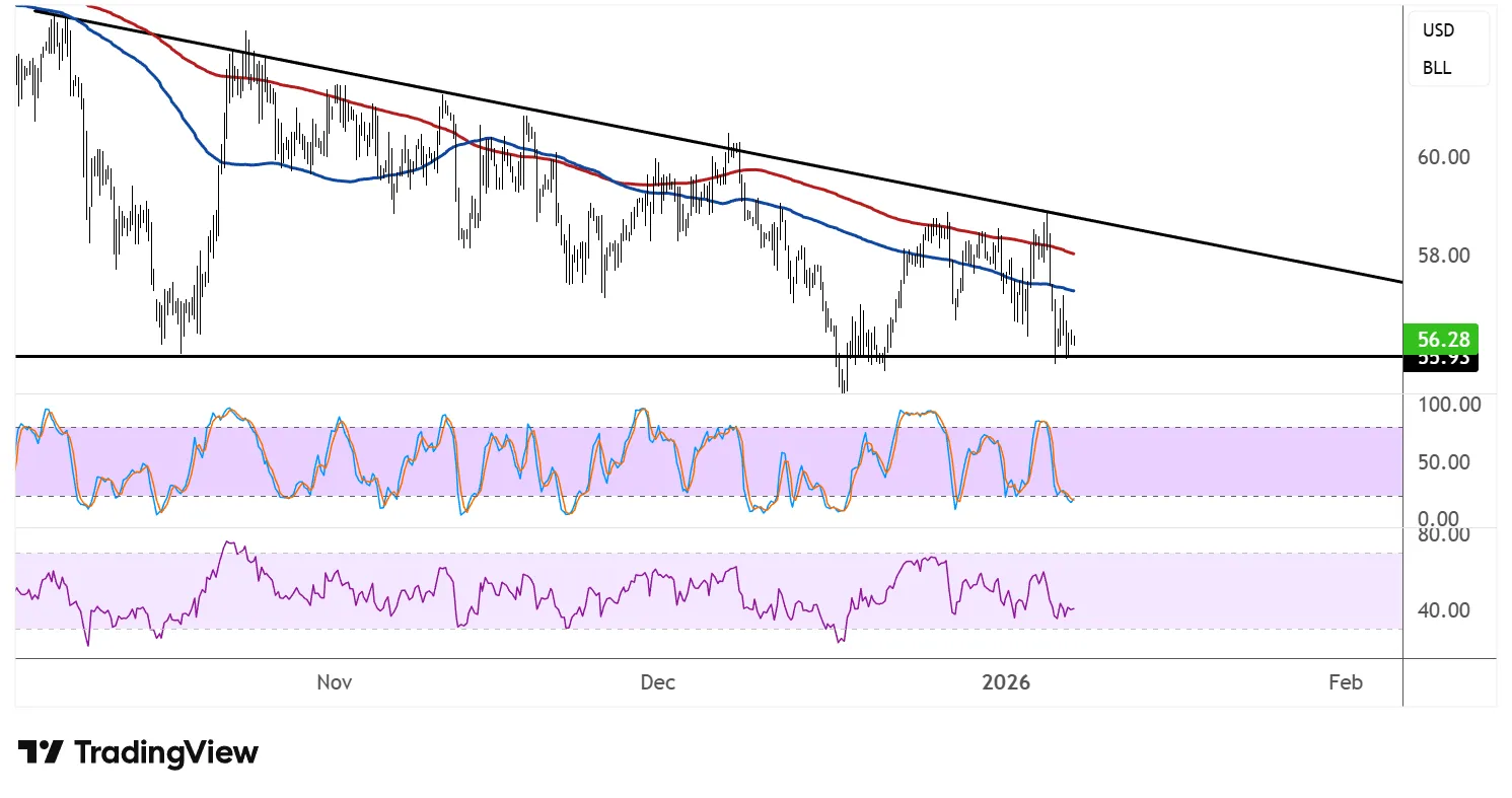 如果每桶55.75美元下行三角形支撑崩溃,原油可能出现更陡峭的下跌,延长长期下跌趋势。该形态的突破通常会导致与形态相同的高度下跌,价格可能推向53.00美元或更低。