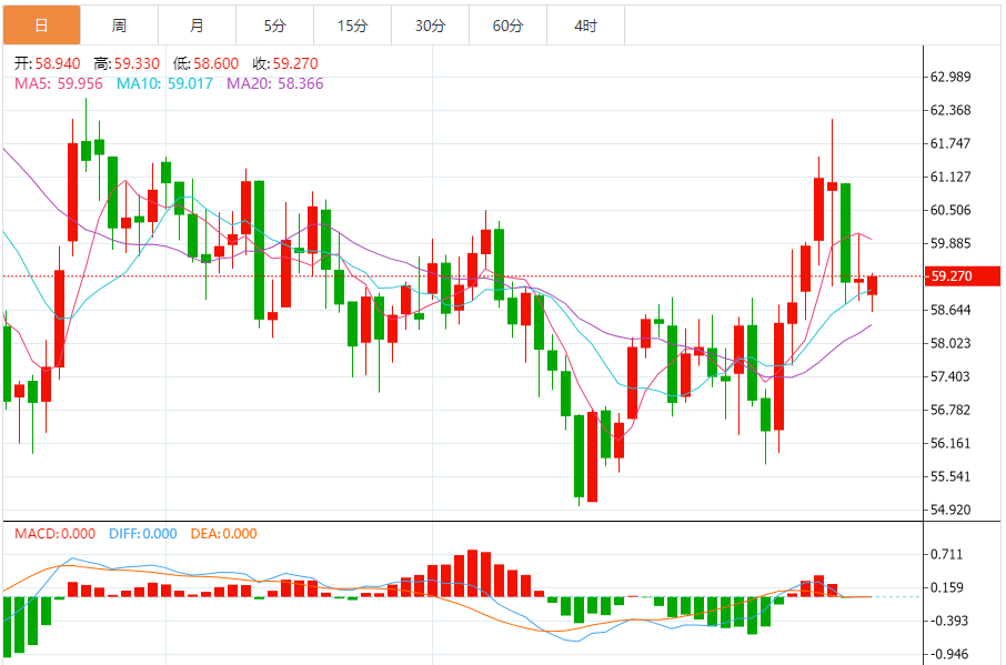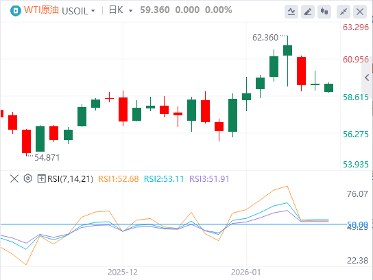 1月19日,原油(WTI)美国原油价格从58.70美元区间反弹,该区为亚洲盘中触及的一周低点,填补了周一空头开盘的大部分空缺。该商品目前交易在59.20美元区间,当天仅下跌0.15%,信号波动不一。