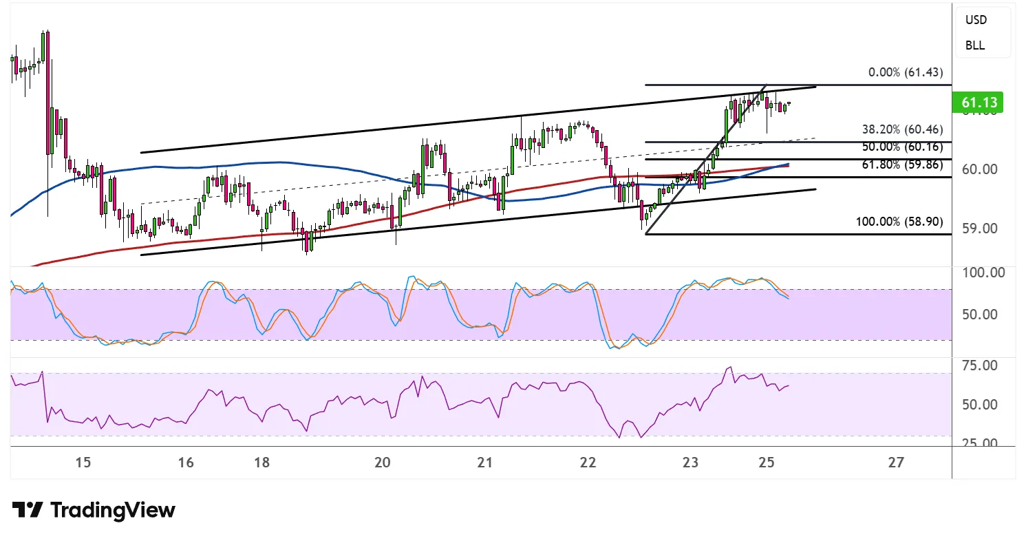 斐波那契回撤工具显示了买家可能在哪里等待防守上涨趋势。38.2%的Fib位于60.46美元,其次是50%的水平,60.16美元。更大的修正可能达到61.8%的斐波根59.86美元,该位置与通道底部重合,可能是维持多头动能的最后一条线。