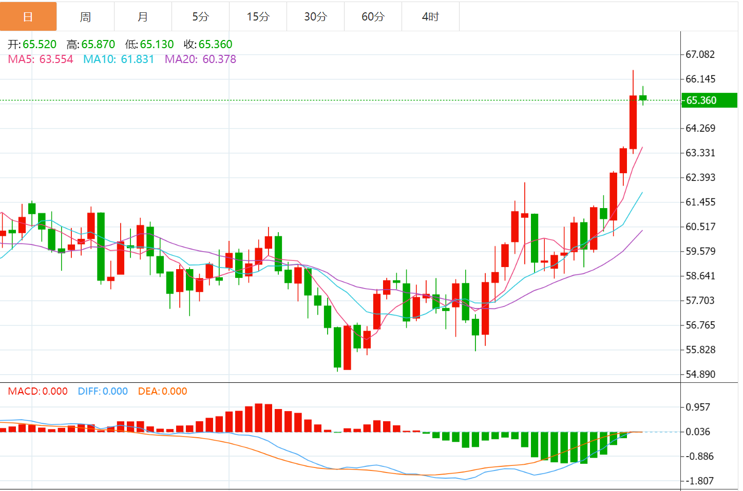 从日线结构看,价格已站稳61.00美元这一关键支撑位,目前正逼近65.09美元的前高区域。MACD指标显示DIFF为1.23,DEA为0.72,MACD柱扩大至1.03,均处于零轴上方且动能仍在增强,说明多头仍占主导。但RSI已达67.78,接近70的超买区间,提示短期上涨动能过快,后续可能出现横盘整理或小幅回调来消化压力。