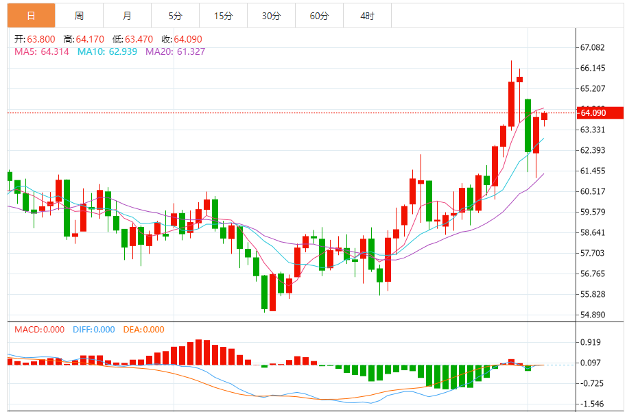 国际盘面中,原油价格大幅反弹,截至当日收盘,WTI原油期货收涨1.72%,报63.21美元/桶,日内最高突破64美元/桶,涨幅近3%;布伦特原油期货收涨1.55%,报67.33美元/桶,最高触及68.27美元/桶,涨幅超2.5%,双双收复前一交易日部分跌幅。国内市场同步跟涨,上期所原油期货夜盘收涨1.78%,报457.8元/桶,主力合约最高462.5元/桶、最低451.7元/桶,成交量63112手,资金回流迹象明显,结束连日下跌态势。