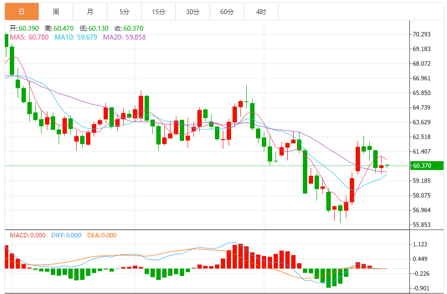 一、日间行情复盘:数据与政策的“过山车”博弈 10月30日原油市场呈现“数据提振冲高、政策压制回落”的剧烈震荡格局。截至欧盘尾盘(20时00分),WTI原油报60.02美元/桶,较开盘价下跌0.61%,日内波动区间59.87-60.73美元;布伦特原油报64.05美元/桶,较开盘价下跌0.34%,波动区间63.92-64.88美元。 行情