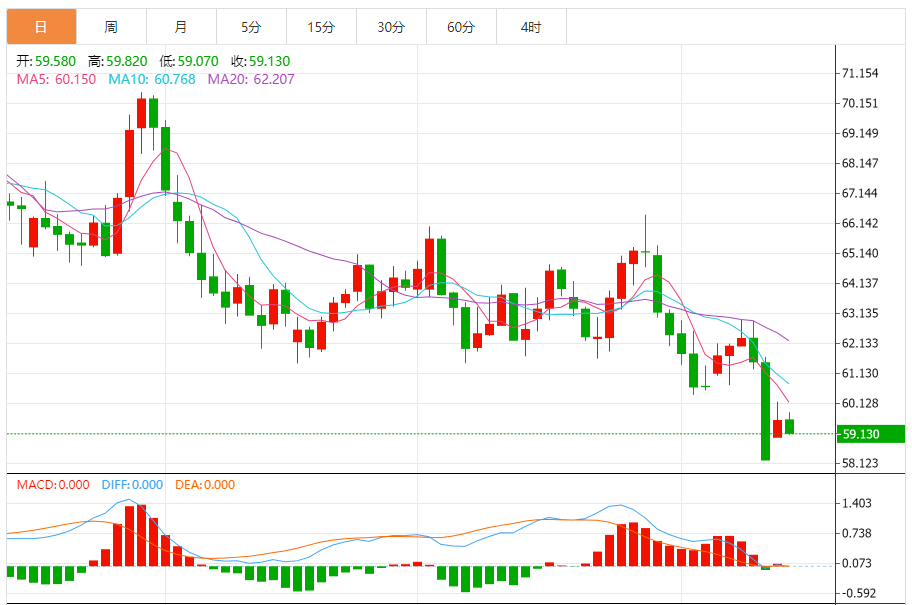 周二(10月14日),美原油价格交投于59.130美元/桶附近,跌幅为0.59%。 原油价格在最近一次盘中交易中小幅上涨,进行有限的修正性反弹以挽回之前的一些损失,但由于仍低于50日指数移动平均线(A50)且在短期内主要看跌趋势的支配下,仍面临较强的下行压力,其价格走势沿趋势线波动,确认了这一趋势。 请注