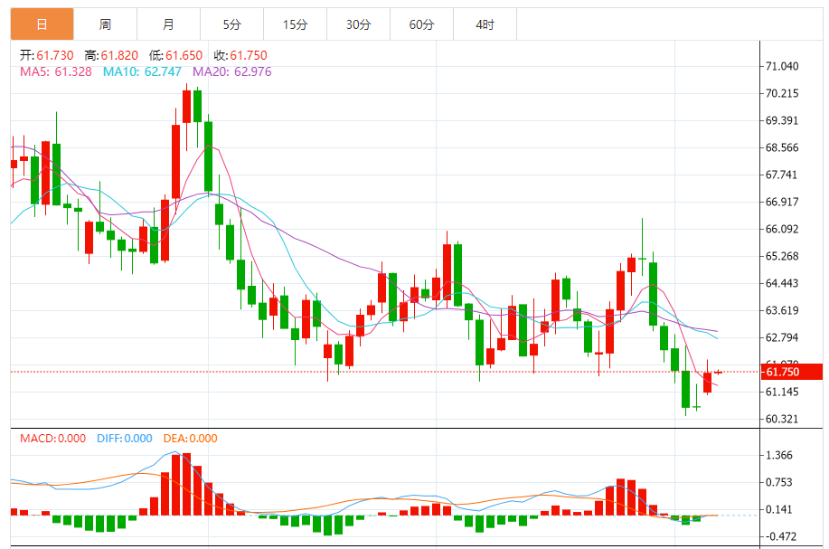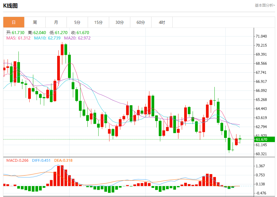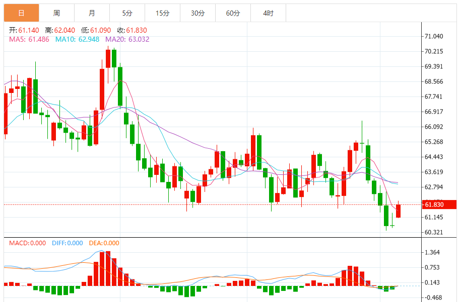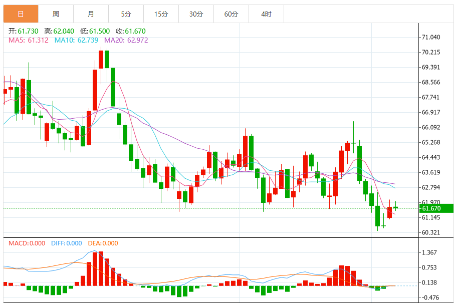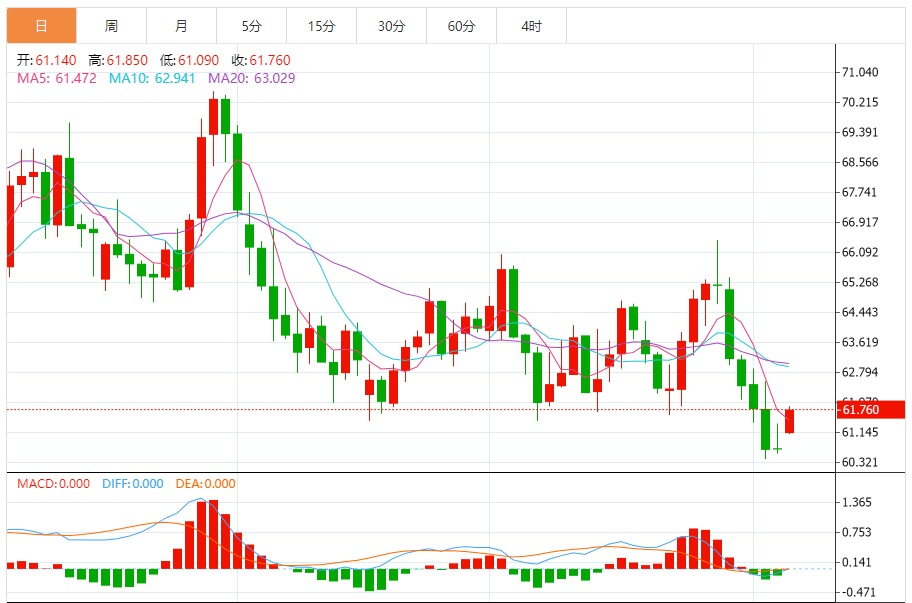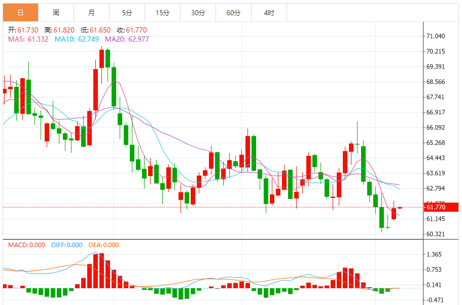 一、实时行情:震荡回落失守关键位,日内振幅超1.5% 10月6日国际油价在多空博弈中呈现“冲高回落”态势,地缘风险支撑弱化后,供需基本面压力再度主导行情。截至当日收盘,纽约商品交易所WTI原油期货11月合约下跌0.72%,报61.44美元/桶,盘中最低触及61.02美元/桶,失守62美元关键支撑位;伦敦布伦特原油期货12月