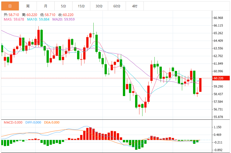 基本消息面 原油价格周四小幅上涨,从前一日的暴跌中略有反弹,交易员在权衡供应过剩创纪录的前景以及美国制裁带来的供应风险。WTI原油期货价格上涨约0.3%,收于每桶59美元下方;此前周三下跌近4.2%,创下6月以来最大单日跌幅。12月交割的WTI原油期货上涨0.34%,结算价为每桶58.69美元,1月布伦特原油上涨0.3%,
