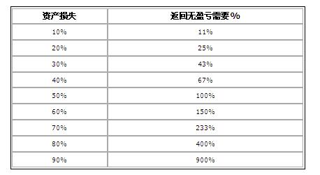 下图告诉你,如果你损失了账户中一定比例的资金,你要赚回多少才能返回无盈亏状态。