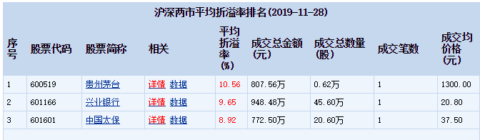 折溢价方面,溢价率最高的个股是贵州茅台,溢价率为10.56%,成交价为1300.00元,成交1笔金额为807.56万元,数量为0.62万股;折价率最高的个股是中设集团,折价率为10.93%,成交价为9.13元,成交1笔金额为410.85万元,数量为45.00万股。