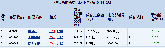 2019年11月28日沪深两市52只个股发生95笔大宗交易,共成交19.37亿元;其中,沪市19只个股共30笔大宗交易,总成交金额为5.80亿元;深市33只个股共65笔大宗交易,总成交金额为13.57亿元。沪指当日收盘报2889.69点,下跌0.47%,下跌14.00点,成交金额1226.17亿元。