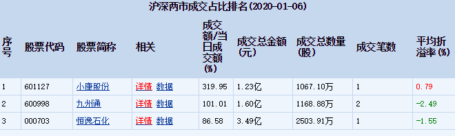 2020年01月06日沪深两市48只个股发生87笔大宗交易,共成交16.76亿元;其中,沪市17只个股共26笔大宗交易,总成交金额为6.07亿元;深市31只个股共61笔大宗交易,总成交金额为10.69亿元。沪指当日收盘报3083.41点,下跌0.01%,下跌0.00点,成交金额3311.83亿元。