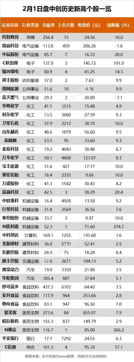 2月1日,沪指收报3505.28点,涨0.64%。东方财富Choic数据显示,今日有37只个股盘中股价创历史新高。其中,个股包括平安银行、妙可蓝多等。