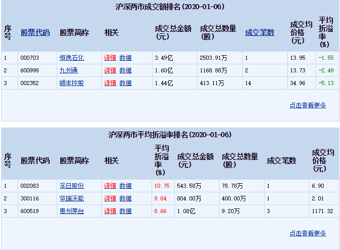 2020年01月06日沪深两市48只个股发生87笔大宗交易,共成交16.76亿元其中,沪市17只个股共26笔大宗交易,总成交金额为6.07亿元;深市31只个股共61笔大宗交易,总成交金额为10.69亿元。沪指当日收盘报3083.41点,下跌0.01%,下跌0.00点,成交金额3311.83亿元。 折溢价方面,溢价率最高的个股是孚日股份,溢价率为10.75%