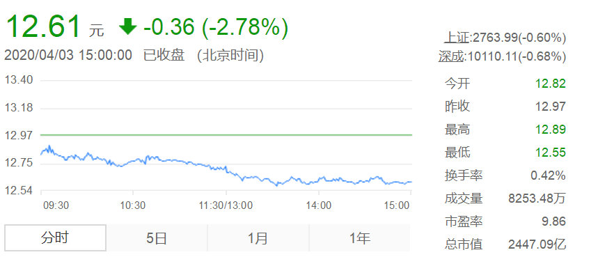 4月3日平安银行股票收盘价12.61元跌幅2.78%。