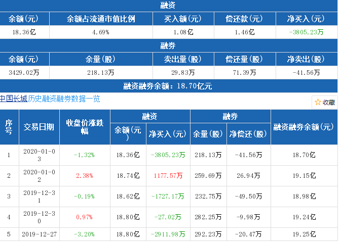 中国长城融资融券信息显示,2020年1月3日融资净偿还3805.23万元;融资余额18.36亿元,较前一日下降2.03%。融资方面,当日融资买入1.08亿元,融资偿还1.46亿元,融资净偿还3805.23万元。融券方面,融券卖出29.83万股,融券偿还71.39万股,融券余量218.13万股,融券余额3429.02万元。融资融券余额合计18.7亿元。 中国长