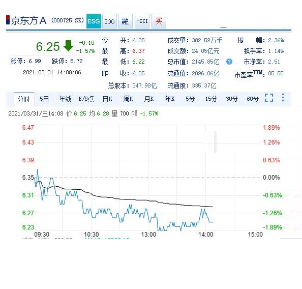 京东方A(000725.Z,收盘价:6.35元):3月30日获市场主力资金净流入6.25亿元,占当天电子板块净流入资金15.93亿元的39.26%,涨幅为1.28%。