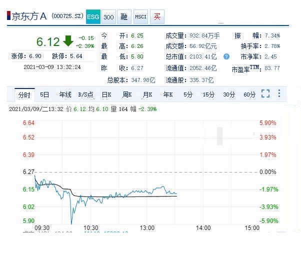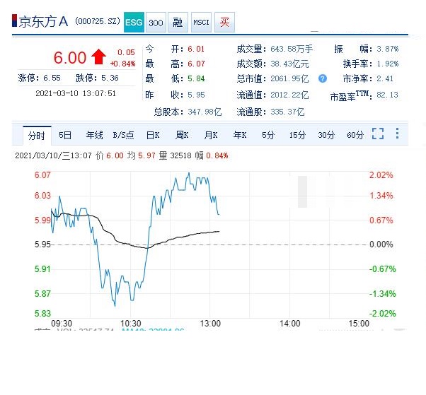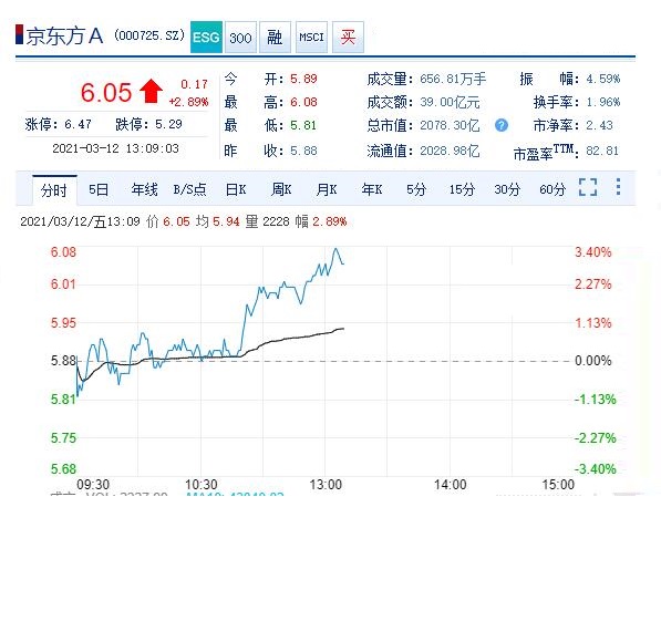 两市震荡回升,电力板块强势,机构买入44.3亿元,领头买入京东方A14.12亿元,主力资金流出32.9亿元。 2021年3月12日,京东方A发生了1笔大宗交易,总成交145.35万股,成交金额882.27万元,成交价6.07元,买卖双方均为机构账户。当日收盘报价6.07元,涨幅3.23%,成交金额62.51亿元;大宗交易成交金额占当日成交金额0.14