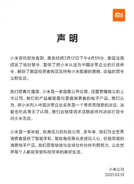 随后,雷军在微博上发声,小米官方发言人也发布了最新的通告,美国方面已经正式官宣暂停了把小米认定为中国涉军企业的行政命令,解除了美国投资者购买及持有小米股票的限制。