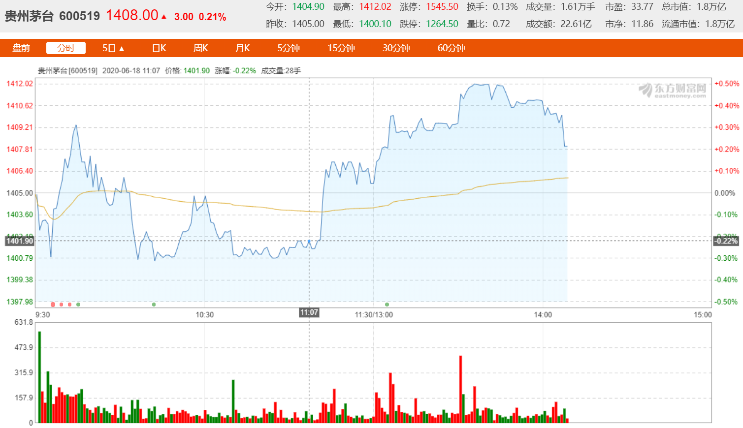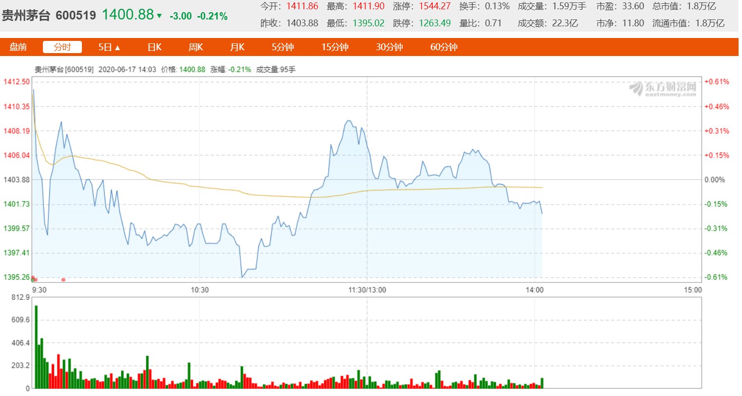 6月11日,贵州茅台盘中跌幅达1.45%,截至13点47分,报1403.06元,成交2.17万,换手率0.17%,最新总市值17625.21亿。