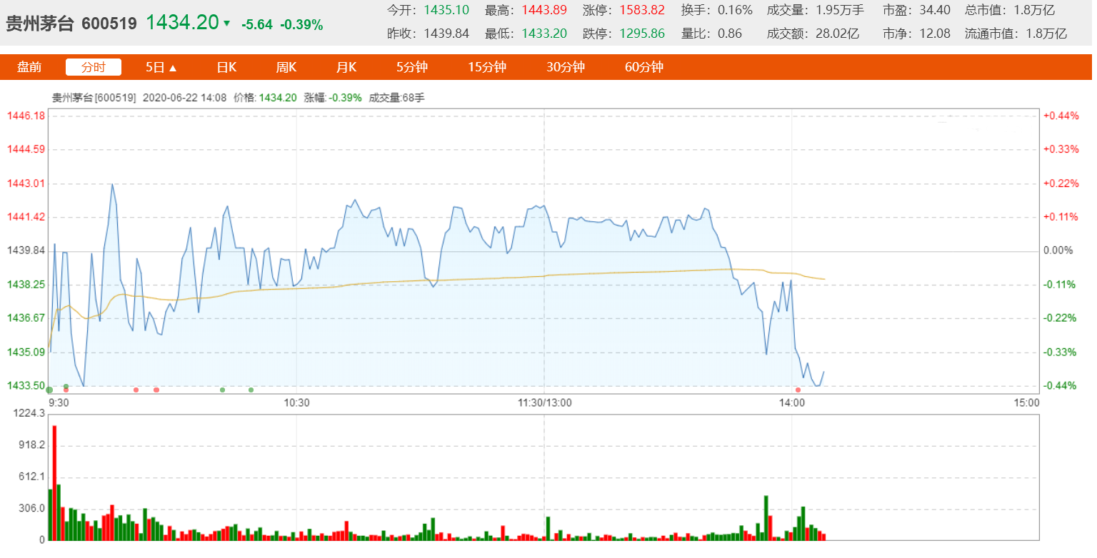 6月22日,贵州茅台盘中跌幅达0.39%,截至14点08分,报1434.20元,成交1.95万,换手率0.16%,最新总市值18007.85亿。