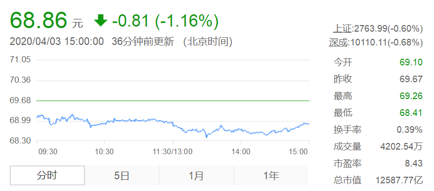 4月3日中国平安股票收盘价68.86元跌幅1.16%。